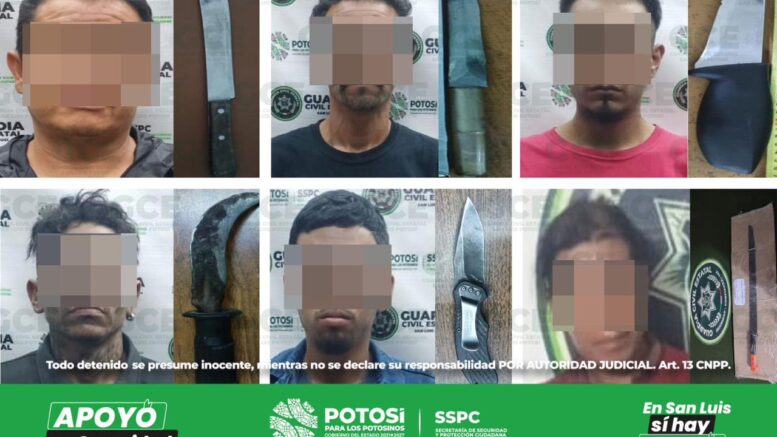 S.L.P.- En diferentes acciones de seguridad y vigilancia, elementos de Guardia Civil Estatal (GCE) detuvieron a seis personas por el probable delito de portación de armas punzocortantes, luego de que se les aseguraran dichos objetos entre sus pertenencias.