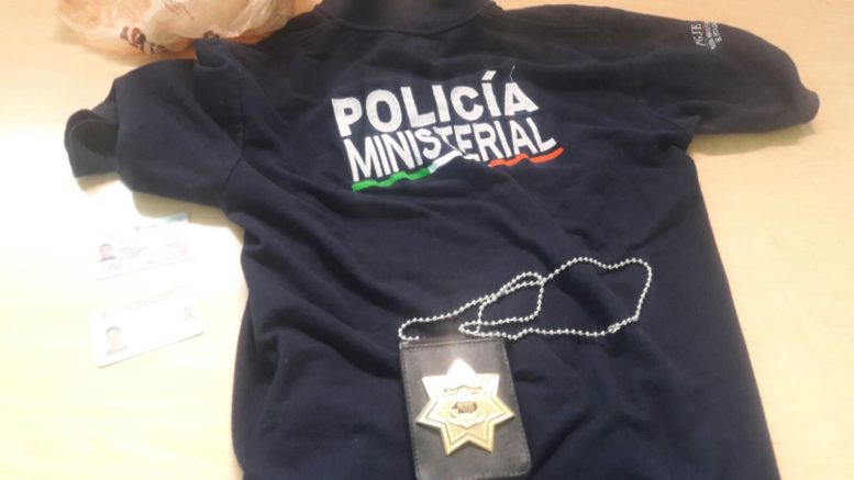 Los elementos de la Policia aseguran al Marco Antonio N de 21 años de edad el sujeto viajaba en un Vehículo Nissan Platina color Blanco, modelo 2005, sin placas de circulación, quien portaba en el interior de una bolsa de nailon en color café una camisa color Azul Marino con logotipo de la policía Ministerial Investigadora, una placa de la misma Autoridad, motivo por el cual es puesto a disposición del Agente del Ministerio Público del Fuero Común de la Unidad de Atención Temprana por los probables delitos de Usurpación de Funciones, Allanamiento demorada, Extorsión en agravio de una mujer de 44 años de edad de la Localidad del Puerto de San Isidro perteneciente al municipio de Lagunillas, S.L.P.