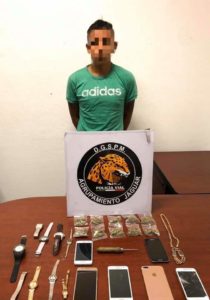 El imputado de 25 años de edad llevaba entre sus pertenencias diez bolsas de plástico con enervante conocido como marihuana en su interior, seis teléfonos celulares, una cadena de material metálico (oro), nueve relojes de diversas marcas y un extensible.