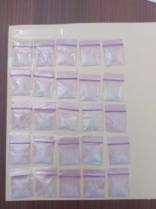 Uno de los sujetos traía una caja de madera en color café y al darle alcance se le pide abrirla, encontrando un total de 25 bolsitas plásticas que en su interior contenían la sustancia sólida y sintética conocida como cristal.