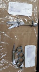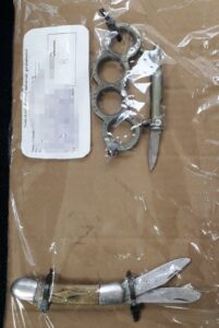 Al efectuarle una revisión corporal le fue encontrado en el bolsillo del lado izquierdo de su pantalón una manopla de metal, de color verde despintado, con la leyenda “USA 30-06” , la cual en la parte superior cuenta con una figura de cartucho, así como de una hoja punzocortante.
