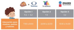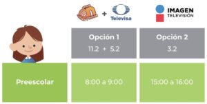 El titular de SEGE, explicó que a reserva de que se llegara a generar alguna modificación por parte de SEP, la programación quedaría de la siguiente manera: para padres de familia, de los niveles de Educación Inicial y Especial, el contenido se transmitirá por los canales 11.2 de Once Niños y 5.2 de Televisa, en los horarios de 7:30 a 8 horas; de las 13:30 a 14 horas por el canal 3.2 de Imagen TV; y de las 22 a las 22:30 por el canal 7.3 de Azteca. En el nivel de Educación Preescolar se transmitirá por los canales 11.2 y 5.2 en un horario de 8 a 9 horas; por el canal 3.2 será de las 15 a las 16 horas, y en este nivel se abordarán ocho asignaturas.