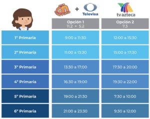 Para el nivel de Educación Primaria, la transmisión se hará por los canales 11.2 y 5.2 de Televisa de 9:00 a 23:30 horas y de 7:30 a 22:00 horas por el canal 7.3 de Azteca y en total serán 10 asignaturas las que se abordarán en los programas de Educación Primaria. Además, la programación de los tres niveles educativos, se transmitirá también por televisión de paga, a través de los canales 144 de TotalPlay; 311 de StarTV; 330 de Sky; 280 de Dish; y por el 311 de IZZI.