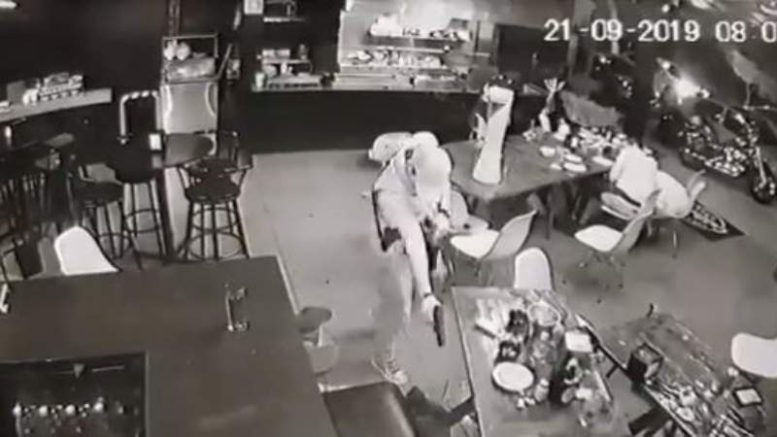En las imágenes se ve que a las 8:07:14 de la noche un sujeto ingresa con fusil de asalto en mano y empieza a disparar contra los comensales.