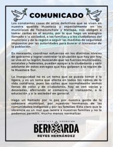 En el comunicado, se puede leer que es necesario coordinar esfuerzos en los distintos niveles de gobierno y lograr controlar la situación que hoy por hoy se vive en la región; buscando que las fuerzas municipales, estatales y federales, puedan apoyar a la ciudadanía y salir delante de estos estragos que hoy golpean a la región de la Huasteca Sur.