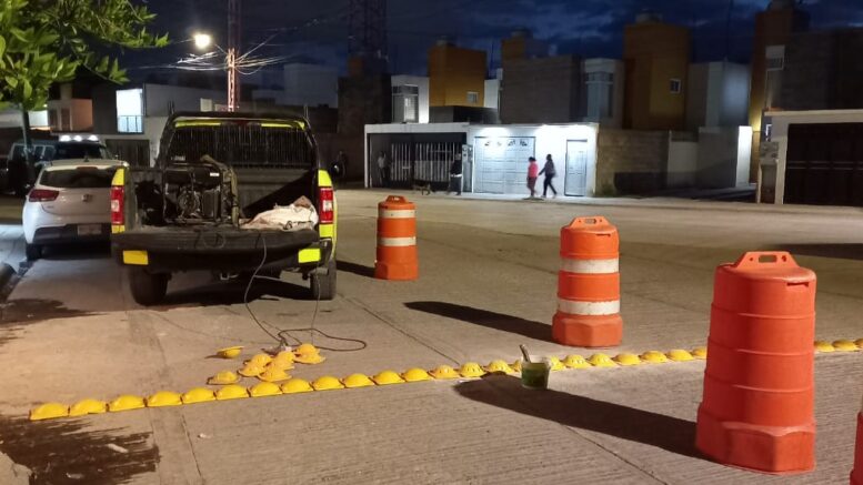 SLP.- En atención a solicitud de vecinos de la colonia Lomas del Mezquital, ubicada en el cuadrante norte de la ciudad, la Dirección General de Policía Vial y Movilidad de la Secretaría de Seguridad y Protección Ciudadana (SSPC) llevó a cabo la instalación de boyas metálicas en el cruce de la calle Galaxia y Prolongación Ponciano Arriaga en la colonia Lomas del Mezquital.