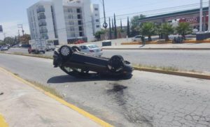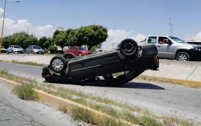 La pareja se desplazaba por la lateral de la carretera a Matehuala y volcó causando daños materiales de consideración y dos lesionados a unos metros antes de llegar a la Avenida San Pedro.