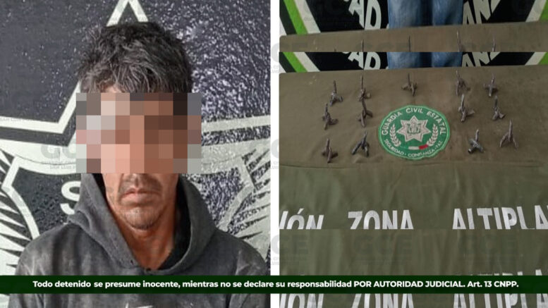 Los hechos ocurrieron en la colonia El Dollar, ahí fue detenido Martín “N” de 34 años de edad, luego de asegurarle 13 artefactos de varilla conocidos como “poncha llantas”, que presumiblemente podrían ser usados para afectar los trabajos operativos de las fuerzas de orden público.