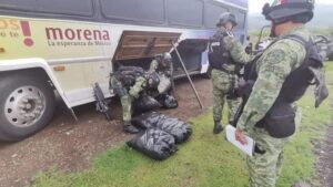 Los hechos ocurrieron cuando elementos del Ejército Mexicano y de la Guardia Nacional, al realizar una inspección de rutina a un autobús de pasajeros, sobre la carretera Apatzingán-Buenavista, Mich., localizaron en uno de sus compartimientos 14 bolsas de plástico color negro que en su interior contenían una sustancia granulada con rasgos semejantes al cristal.