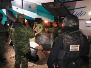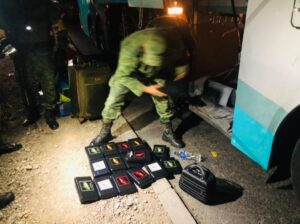 Efectivos castrenses en coordinación con elementos de la Guardia Nacional, establecidos en un puesto militar de seguridad en el entronque a Villa de Pozos, San Luis Potosí, S.L.P., hicieron la revisión a un autobús de pasajeros, localizando en el interior de 3 maletas un total de 43 paquetes, los cuales contenían un polvo blanco con las características propias a la cocaína, con un peso aproximado de 50.4 kilogramos. en donde fueron detenidas dos personas .