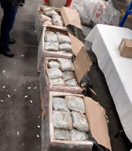 En el primer en el Aeropuerto Internacional Ponciano Arriaga, Mpio. de Soledad de Graciano Sánchez, S.L.P., al llevar a cabo una revisión de manera aleatoria en las bandas de paquetería y con el apoyo de un binomio canófilo, el cual marcó positivo en cuatro cajas de cartón, conteniendo en el interior de cada una de ellas, hierba seca con olor y características propias a la marihuana, arrojando un peso total de 54 kilos 45 gramos.