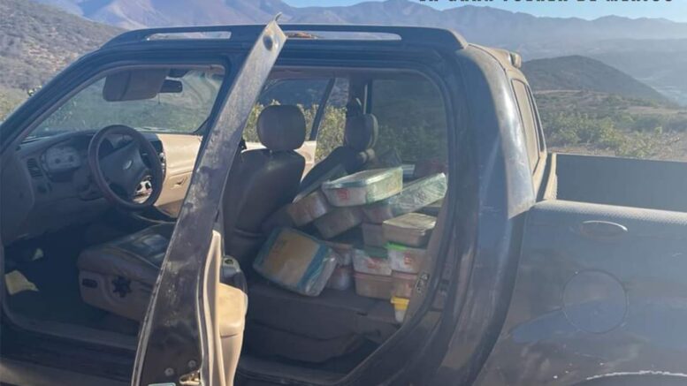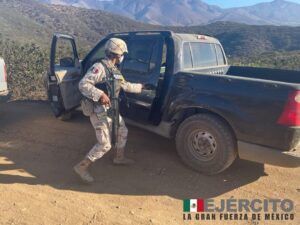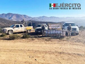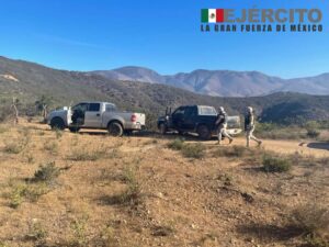 Como resultado de actividades de inteligencia, el personal militar realizó reconocimientos terrestres en el Ejido Acámbaro, municipio de Ensenada, B.C., localizando dos camionetas abandonadas, en las que se encontraron aproximadamente 414 kilogramos de una sustancia con características propias a la metanfetamina.