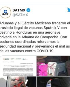 La Administración General de Aduanas, en coordinación con el Ejército Mexicano, decomisó más de con mil dosis de vacunas rusas Sputnik V en el Aeropuerto Internacional de Campeche, que pretendían ser trasladadas en una aeronave privada a Honduras.