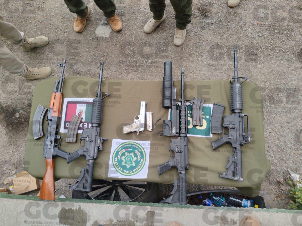 Durante la intervención inicial, y aplicando rigurosamente los protocolos establecidos, los elementos de la GCE y SEDENA lograron la detención de cinco personas. En esta primera acción, se aseguraron cuatro armas largas, un arma corta, múltiples cargadores y cartuchos útiles, además de un vehículo que, tras su verificación, no contaba con reporte de robo.