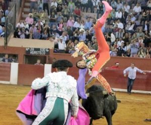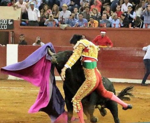 La embestida que acertara el astado llamado “Huasteco” fue certera en la humanidad del matador quien por segundos fue lanzado por los aires y arrastrado por varios metros en la arena ante la mirada de cientos de asistentes que veían la fuerza con la que el torero era cornado por un toro de mas de 500 kilos de peso.