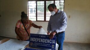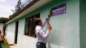 Fue el Alcalde, Saúl Moreno Martínez, quien procedió de manera inmediata a la colocación de la lámina que corresponde a la calle de Daniel Montealvo, en la cual se localiza el salón ejidal, y el jardín de niños del lugar.