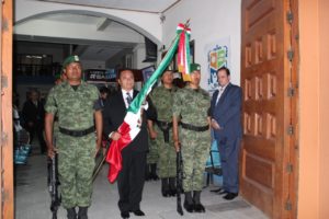 Previamente en el salón de Cabildo se llevó a cabo la ceremonia de entrega de bandera por parte de la escolta de la elementos de la Guardia Nacional, quienes a la vez acompañaron al Alcalde en el recorrido efectuado por los alrededores de la plaza principal portando el lábaro patrio.