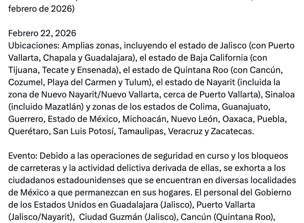 La Embajada estadounidense también informó que, de acuerdo con anuncios de autoridades mexicanas, se aplicarían restricciones temporales en diversas autopistas de peaje del país debido a bloqueos registrados tras los hechos violentos.
