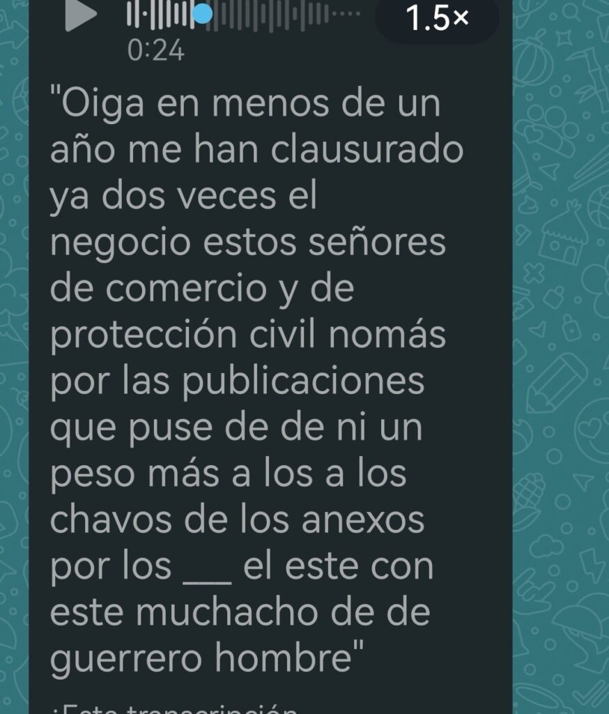 El denunciante aseguró haber recibido una amenaza directa durante la inspección: “Bájale a tus publicaciones contra el patrón o te clausuramos para siempre”, advirtiéndole que cesara sus críticas hacia el alcalde Urbiola.