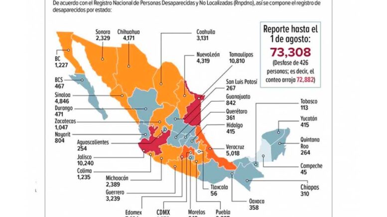 De acuerdo con el Registro Nacional de Personas Desaparecidas y No Localizadas (Rnpdno), que da a conocer la Comisión Nacional Búsqueda (CNB), hasta ayer había 73 mil 308 personas desaparecidas y no localizadas, de ellas sólo Tamaulipas (10,810), Jalisco (10,240), Estado México (7,684), Veracruz (5,018), Sinaloa (4,846), Nuevo León (4,319) y Coahuila (3,131) sumaban 47 mil 88 personas desaparecidas y no localizadas.
