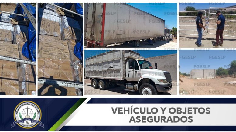 SLP. – Con base a una orden de cateo, agentes de la Policía Investigadora de la Fiscalía General del Estado de San Luis Potosí (FGESLP), ingresaron a un inmueble ubicado en la delegación de Villa de Pozos, perteneciente a la ciudad capital, donde se recuperó un vehículo de motor marca internacional color blanco, tipo tritón de redilas con carga y un semi remolque tipo caja seca en color blanco, ambos con reporte de robo.