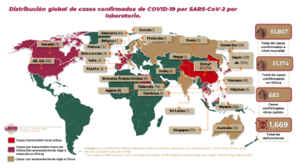 - Hasta la fecha, se han reportado casos en 25 países fuera de China, los casos se han notificado en cinco regiones de la OMS (América, Europa, Asia Sudoriental, Mediterráneo Oriental y Pacífico Occidental).