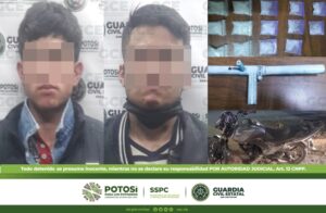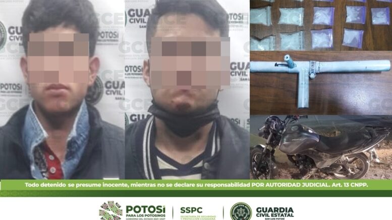 Estas personas identificadas como Adrián N. de 25 años de edad y José de 19 años de edad portaban un arma de fuego hechiza de las denominadas “cachimbas”, y además 14 bolsitas plásticas en cuyo interior había droga sintética conocida como “cristal”, con un peso de 14.4 gramos; de igual forma se les asegura una motocicleta marca Italika en color negro, en la cual se desplazaban misma sin reporte de robo.