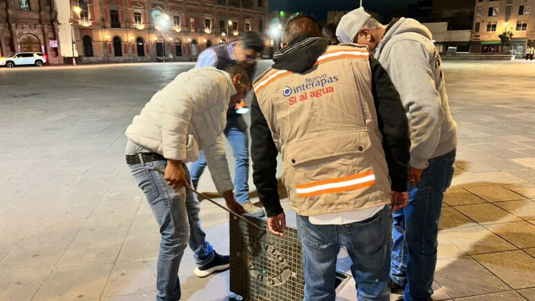 SLP.- A petición de reportes vecinales sobre una posible fuga de gran magnitud, INTERAPAS llevó a cabo una revisión nocturna en el primer cuadro del Centro Histórico de la ciudad capital.