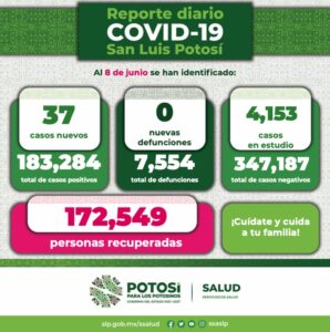 De estos nuevos contagios, 27 se detectaron en la Jurisdicción Sanitaria I; siete en la Jurisdicción Sanitaria IV de Rioverde; uno en la Jurisdicción Sanitaria V de Ciudad Valles; en personas residentes de otra entidad hay dos nuevos contagios; y ninguno en las siguientes jurisdicciones sanitarias: II de Matehuala, III de Villa de Pozos, VI de Tamazunchale y VII de Tancanhuitz