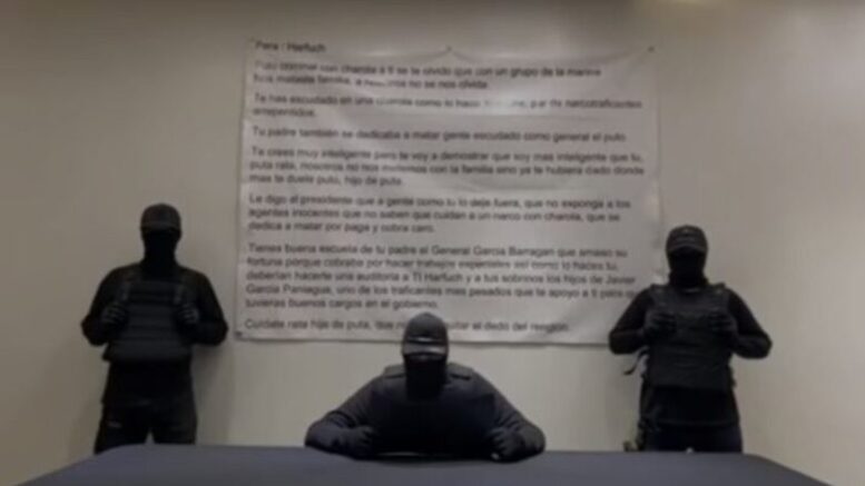 Flanqueado por dos hombres que están parados, el tercer integrante del grupo lee –sentado– el mensaje donde se afirma que García Harfuch asesinó a un familiar de los presuntos delincuentes, durante un operativo en el que también participó la Secretaría de Marina-Armada de México.