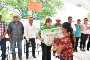 En seguida, se entregaron de manera simbólica dos cuneros a las madres de familia del ejido Zaragoza, Dora Hilda Martínez y Rosalba Ángeles Gutiérrez, además se entregó un andador a Anastacia Pérez Vázquez, quien es una persona de la tercera edad y enfrenta problemas para caminar.