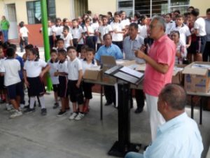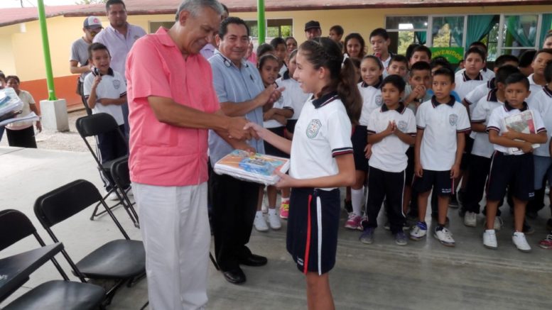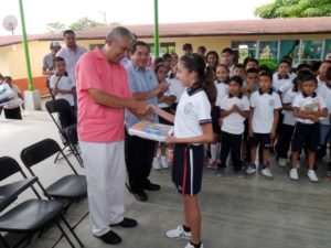 En seguida, se entregaron de manera simbólica los paquetes de útiles escolares por las autoridades municipales, de cuarto grado recibieron: Darío Galván Gómez y Cinthia Martínez Hernández; de quinto: Ángel Gabriel Martínez Martínez y Yudith Camacho Sánchez; y de sexto grado: Melanie Orduno Villedas y César Ignacio Reyes Rodríguez.