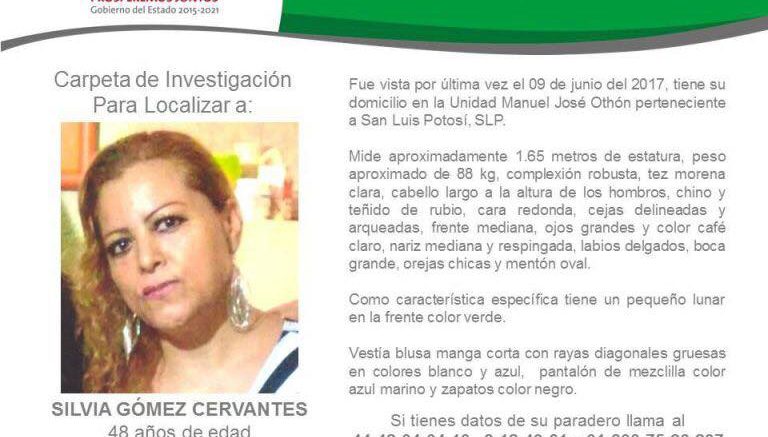 Silvia tuvo su domicilio en la Unidad Habitacional Manuel José Othón, contaba con 48 años de edad, y fue reportada por la procuraduria como desaparecida el pasado 9 de junio del 2017