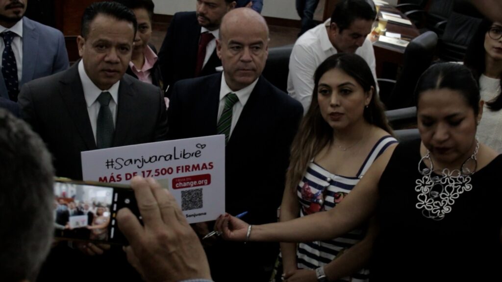 Esta mañana, familiares de Sanjuana, docentes del Tecnológico de Matehuala y diversas organizaciones de la sociedad civil, lideradas por Perteneces, irrumpieron en la sesión ordinaria del Congreso del Estado de San Luis Potosí para exigir la libertad de Sanjuana Maldonado; y en un acto simbólico, entregaron las 17,500 firmas recogidas en apoyo a su liberación.