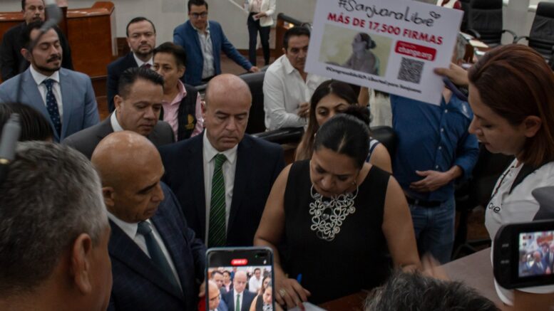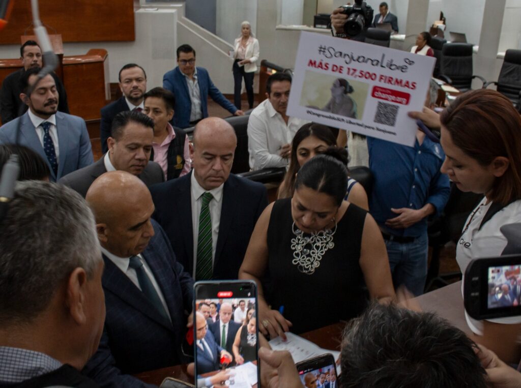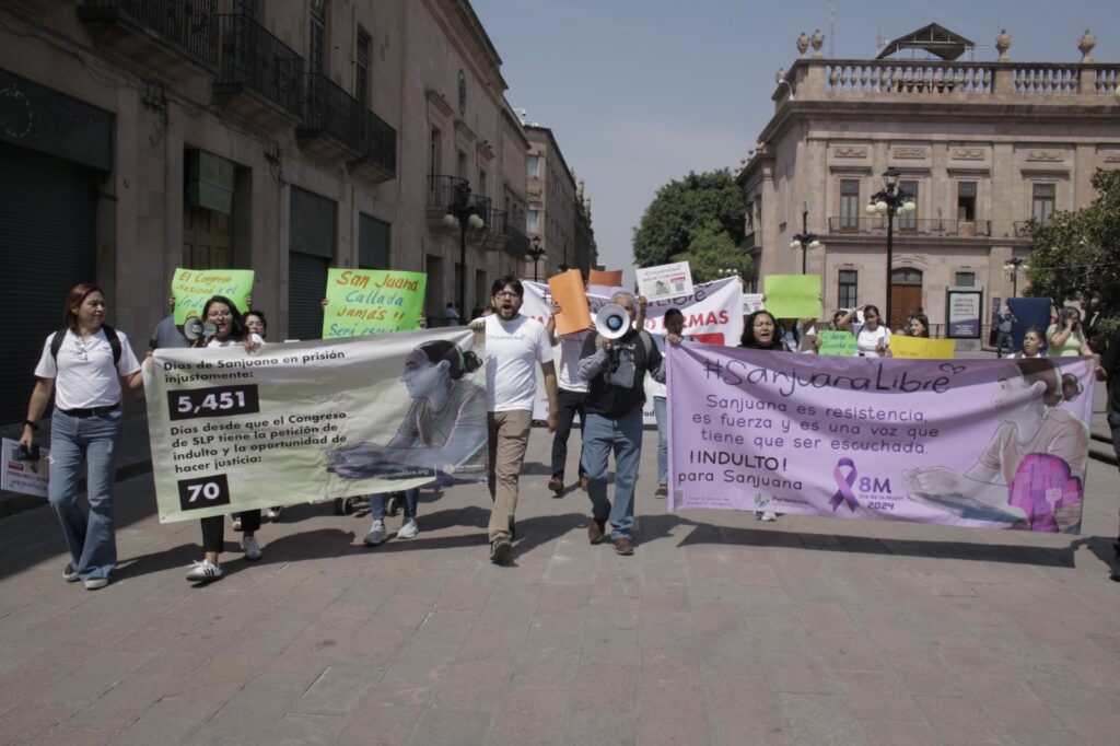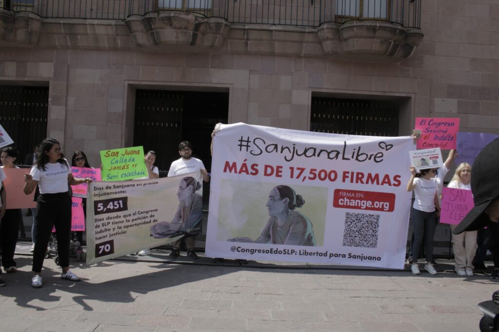 Durante su ingreso al recinto legislativo, el contingente expresó consignas como “Diputados del Estado, el indulto es esperado”, “Sanjuana aguanta, las mujeres se levantan” y “Sanjuana es inocente, lo dice el expediente”. Ante esta manifestación, la sesión ordinaria del Congreso tuvo un receso para que los legisladores escucharan las peticiones.