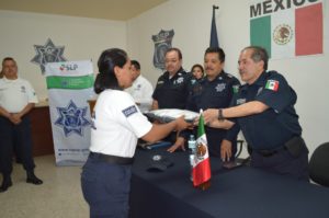 Durante la ceremonia el General Ángel Gámez Segovia, Director General de Seguridad Pública del estado (DGSPE), en representación del General Arturo Gutiérrez García, Secretario de Seguridad Pública del Estado, entregó uniformes a policías procesales de la DGSPE, de la Dirección de Seguridad Pública Municipal en San Luis Potosí y de la Dirección General de Prevención y Reinserción Social.