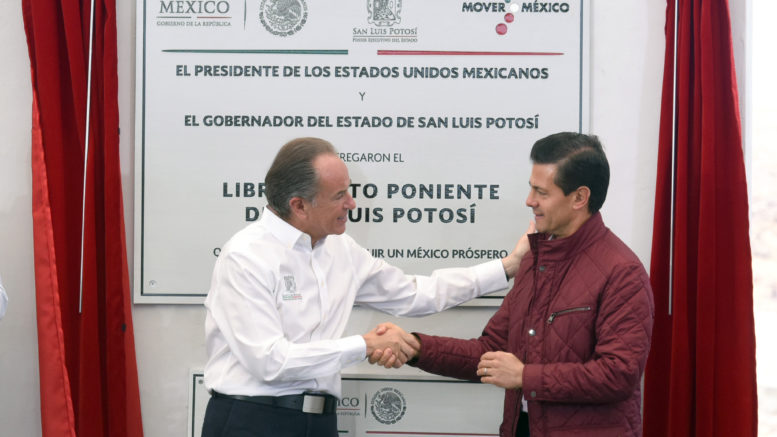 Tras poner en marchar esta nueva vialidad Peña Nieto felicitó al mandatario potosino por el gran compromiso para presentar proyectos e impulsar el desarrollo compartido, para sumar esfuerzos y trabajar en equipo con la federación con actitud positiva y constructiva a favor del estado.