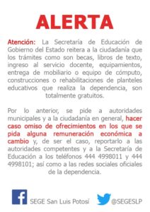 El Secretario de Educación de Gobierno del Estado, reiteró a la sociedad en general que los trámites como son becas, libros de texto, equipamientos, entrega de mobiliario o equipo de cómputo, construcciones o rehabilitaciones de planteles educativos que realiza la SEGE, son totalmente gratuitos, e hizo un llamado a la comunidad educativa para que estén atentos, ya que se han presentado casos en los que personas que se hacen pasar por el Secretario de Educación, ofrecen a autoridades municipales o miembros de los cabildos apoyos a cambio de dinero.