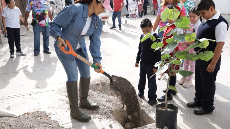 A la campaña de reforestación “Reverde-ser”, iniciativa de la presidenta del Sistema Municipal para el Desarrollo Integral de la Familia (SMDIF), de Rioverde, Karina Quintero de Urbiola, se sumaron este lunes tres escuelas del municipio, para plantar nuevos árboles de sombra, en tres calles de la colonia El Ébano.