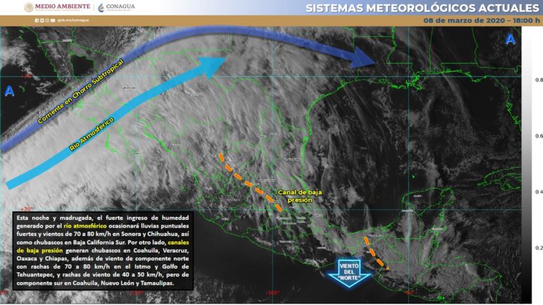 Pacífico Norte: Cielo nublado con intervalos de chubascos en Sonora. Ambiente templado a cálido y viento del noroeste de 15 a 30 km/h en la región.