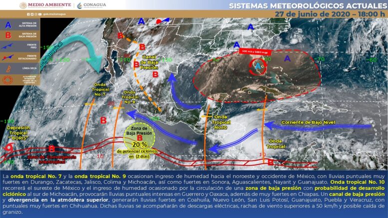 Durante esta noche y madrugada, la onda tropical No. 7 se extenderá al suroeste de la Península de Baja California y la onda tropical No. 9 se ubicará al suroeste de las costas de Jalisco, ocasionando ingreso de humedad hacia el noroeste y occidente de México, con lluvias puntuales muy fuertes en Durango, Zacatecas, Jalisco, Colima y Michoacán, así como fuertes en Sonora, Aguascalientes, Nayarit y Guanajuato. Por otra parte, la onda tropical No. 10 recorrerá el sureste de México y el ingreso de humedad ocasionado por la circulación de una zona de baja presión con probabilidad de desarrollo ciclónico al sur de Michoacán, provocarán lluvias puntuales intensas en Guerrero y Oaxaca, además de muy fuertes en Chiapas. Un canal de baja presión y divergencia en la atmósfera superior, generarán lluvias fuertes en Coahuila, Nuevo León, San Luis Potosí, Guanajuato, Puebla y Veracruz, con puntuales muy fuertes en Chihuahua. Dichas lluvias se acompañarán de descargas eléctricas, rachas de viento superiores a 50 km/h y posible caída de granizo.