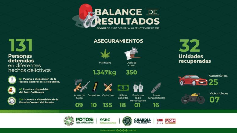 –           La dependencia estatal informa de los resultados del 29 de octubre al 4 de noviembre, en el marco de las acciones desplegadas del Plan Integral de Seguridad en San Luis Potosí.