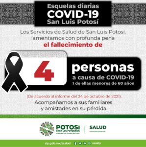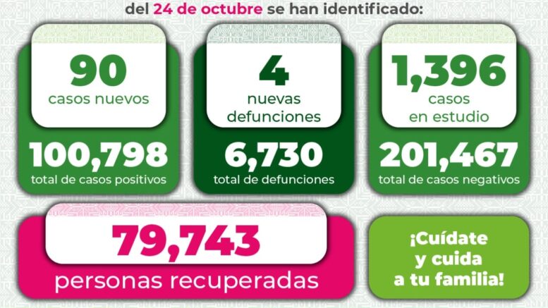 La Secretaría de Salud de San Luis Potosí y el Comité Estatal para la Seguridad en Salud, informan que, hasta este domingo 24 de octubre, se registran 100 mil 798 casos totales de Covid-19, con la confirmación de 90 nuevos contagios de acuerdo al reporte epidemiológico de las últimas 24 horas.