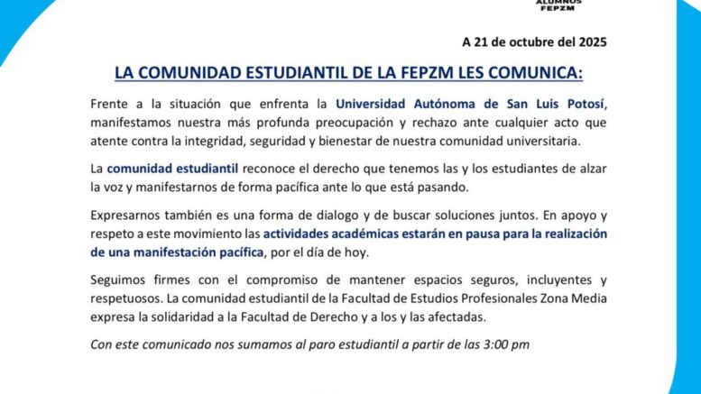 A partir de las tres de la tarde de este día, las actividades académicas y administrativas en el campus de la Zona Media quedarán suspendidas. La decisión busca unirse a las acciones de protesta que los estudiantes de diversas facultades han mantenido en la capital potosina, manifestando su apoyo y sumándose a las demandas universitarias que han generado el actual movimiento.