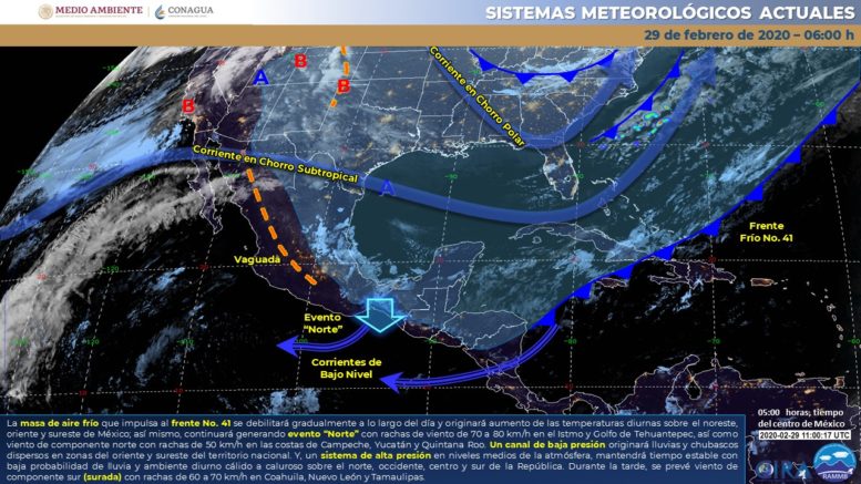 Para este día, la masa de aire frío que impulsa al frente No. 41 comenzará a debilitarse gradualmente a lo largo del día y originará aumento gradual de las temperaturas diurnas sobre el noreste, oriente y sureste de México; así mismo, continuará generando evento “Norte” con rachas de viento de 70 a 80 km/h en el Istmo y Golfo de Tehuantepec, así como viento de componente norte con rachas de 50 km/h en las costas de Campeche, Yucatán y Quintana Roo. Un nuevo frente frío (No. 42) se aproximará a Baja California y, en combinación con la entrada de humedad del Océano Pacífico generada por la corriente en chorro, ocasionará lluvias sobre dicha entidad, además de viento con rachas de 60 a 70 km/h en Baja California, Sonora, Chihuahua y Golfo de California. Un canal de baja presión sobre el oriente del país, originará lluvias y chubascos dispersos en zonas del oriente y sureste del territorio nacional. Y, un sistema de alta presión en niveles medios de la atmósfera, mantendrá tiempo estable con baja probabilidad de lluvia y ambiente diurno cálido a caluroso sobre el norte, occidente, centro y sur de la República. Durante la tarde, se prevé viento de componente sur (surada) con rachas de 60 a 70 km/h en Coahuila, Nuevo León y Tamaulipas.