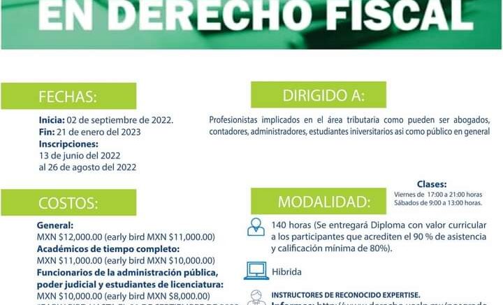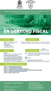 Con el fin de estar a la par de las actualizaciones tributarias, la División de Estudios de Posgrado de la Facultad de Derecho “Abogado Ponciano Arriaga Leija” de la Universidad Autónoma de San Luis Potosí (UASLP), ofertará el Diplomado en Derecho Fiscal para ayudar no solamente a abogados, sino a profesionistas como contadores, administradores, estudiantes universitarios o público en general,.