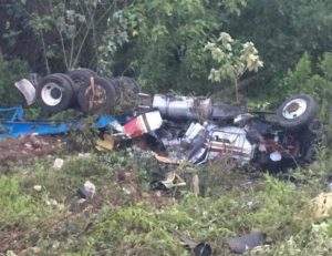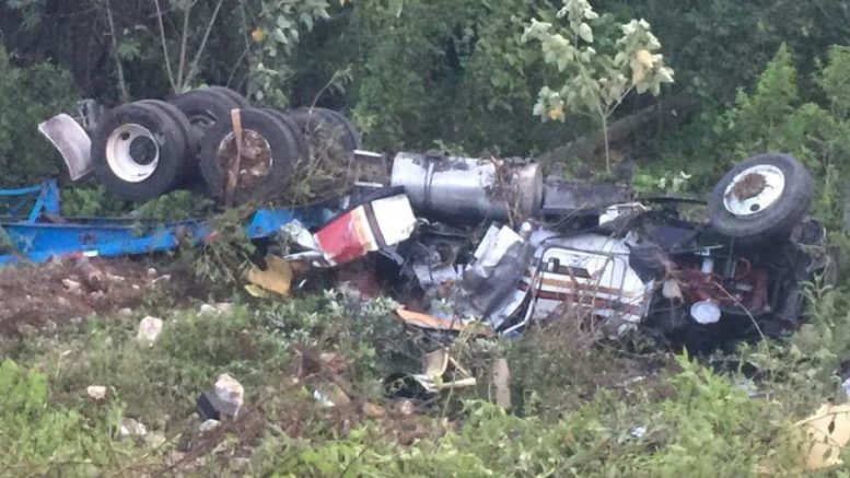 Hacia un desnivel se volcó un tráiler de cabina blanca y remolque tipo plataforma color azul, en el que viajaban dos personas, al parecer un hombre y una mujer, quienes fallecieron.