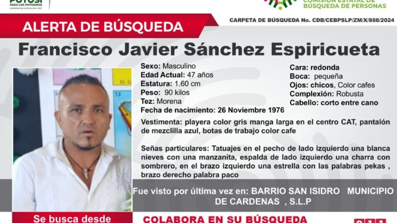Le escribe una familia Cardenense desesperada por encontrar a su familiar FRANCISCO JAVIER SÁNCHEZ ESPIRICUETA, quien está desaparecido desde el 15 de octubre.