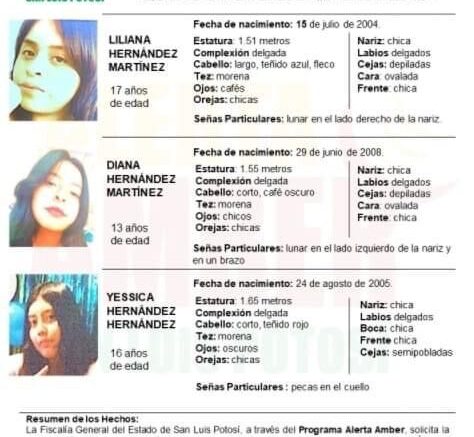Las menores desaparecidas son las hermanas Diana Hernández de 13 años y Liliana Hernández de 17 años y su prima Jessica Hernández de 16 años, de las tres nadie ha sabido nada, por lo que familiares solicitaron apoyo de las redes ciudadanas para dar con el paradero de las niñas.