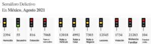 Ciudad de México, a 29 de septiembre de 2021.– Semáforo Delictivo reporta 5 delitos en rojo, 5 en amarillo y uno en verde en el mes de agosto. Los delitos en rojo son dos de crimen organizado: extorsión y narcomenudeo; y tres delitos socio-familiares: violación, violencia familiar y feminicidio. Todos ellos están por arriba de su media histórica mensual; mientras que el Feminicidio rompió récord histórico con 107 víctimas en el mes.